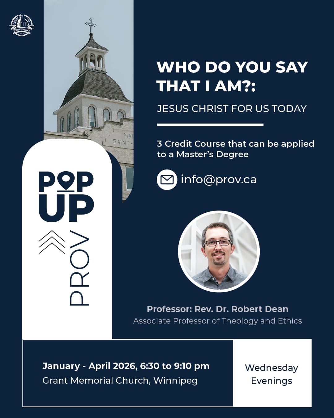 WHO DO YOU SAY THAT I AM: JESUS CHRIST FOR US TODAY is the next Pop Up Prov graduate-level course being offered in January. It’s taught by Rev. Dr. Robert Dean, Associate Professor of Theology and Ethics. Offered Wednesday evenings from January to April 2026 at Grant Memorial Church in Winnipeg, this 3-credit Biblical & Theological Studies course explores Jesus’ defining question—“Who do you say that I am?” Through engagement with classical and contemporary voices, participants will deepen their understanding of Christ, the mission of the church, and the call to faithful discipleship.